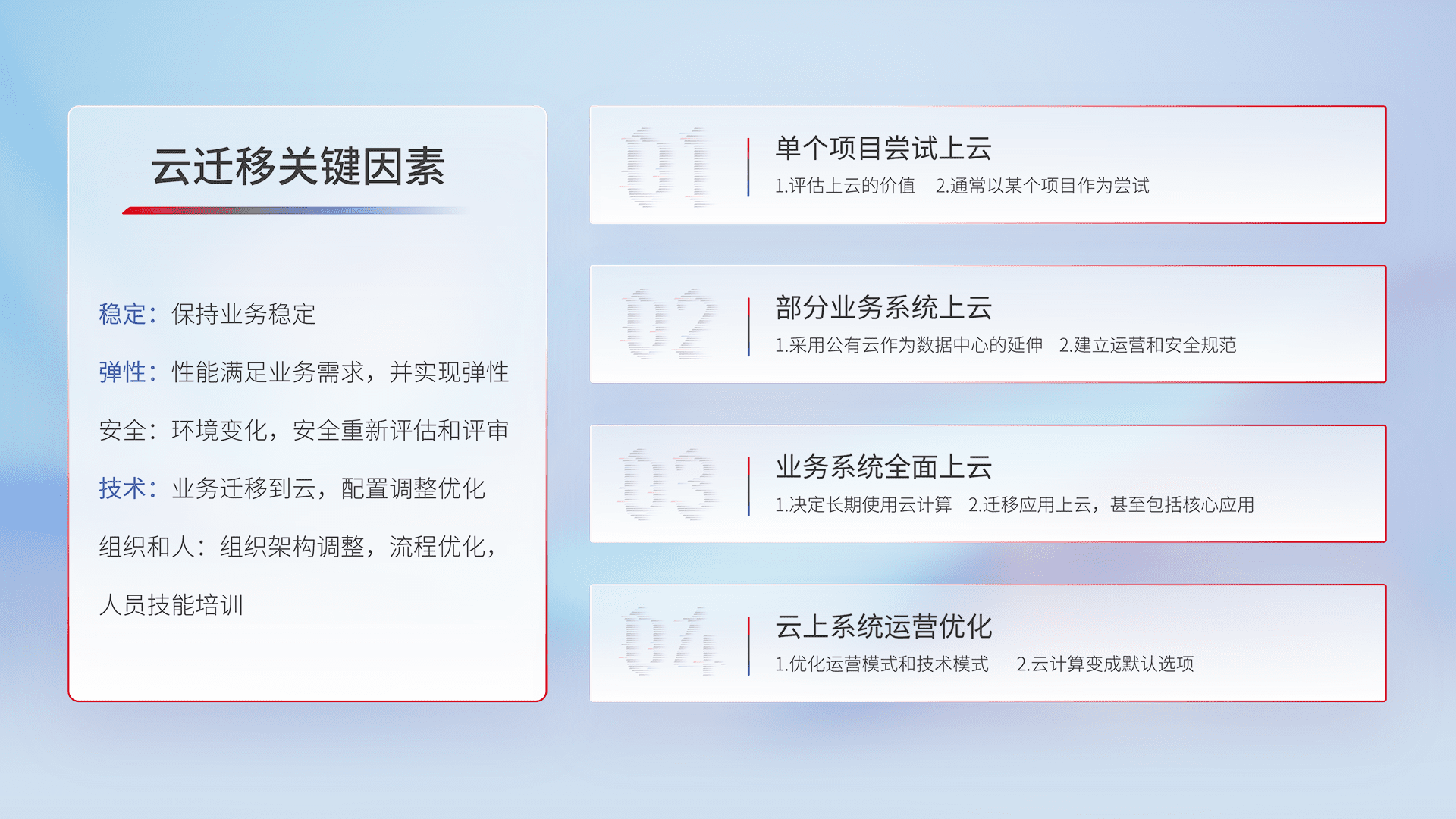 结合实际业务,,,从规划设计、、、、云平台选型、、、云原生改造、、数据迁移、、集成交付,,迁移全过程为客户识别最佳上云路径,,做好风险识别管理,,设计网络架构、、、、身份权限、、、、安全审计合规、、操作审计、、、、日志审计、、、监控告警策略、、、、多站点容灾设计等,,,对云上基础设施进行整体规划,,,,提升IT治理水平,,,以满足弹性、、高可用、、高性能的需求。。。