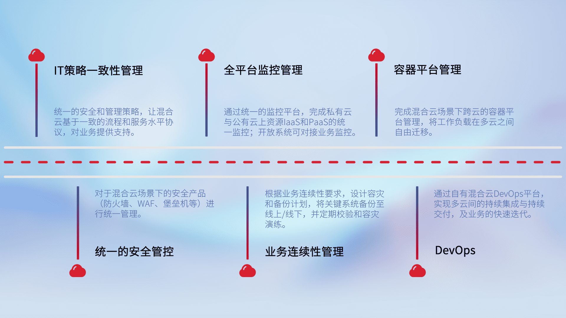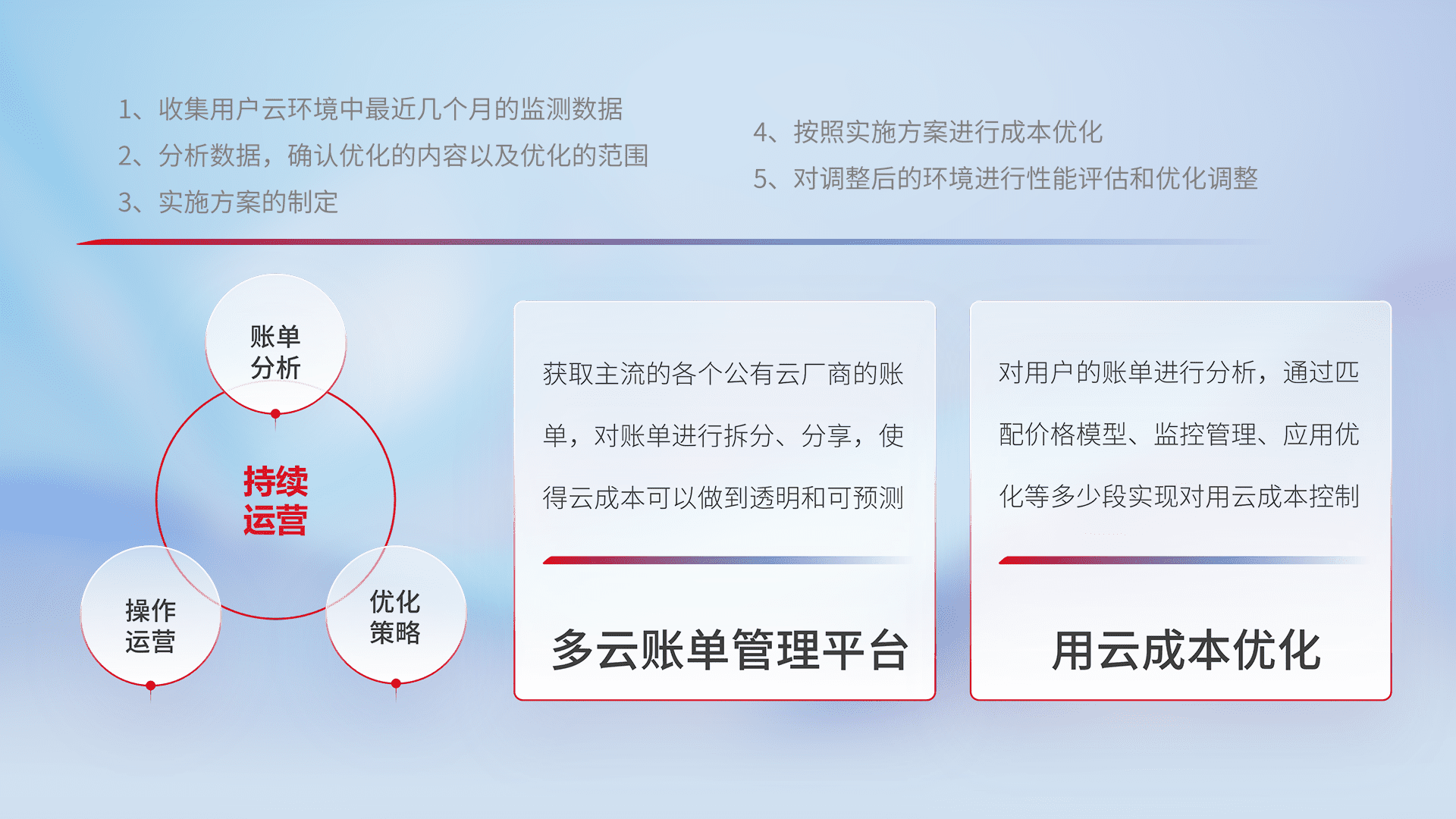 通过多云纳管,,,以统一的资源数据模型把客户的云资源进行抽象和封装,,进而实现对多云资源的统一操作,,保障云资源管理的可靠性、、、稳定性与可用性。。。量身定制化运维内容,,,配置、、、开发运维、、补丁管理、、、备份、、、、监控、、认证和访问管理、、、审计和日常巡检等,,,,保障在用云过程中的可靠度,,,稳定度以及高可用率。。。
